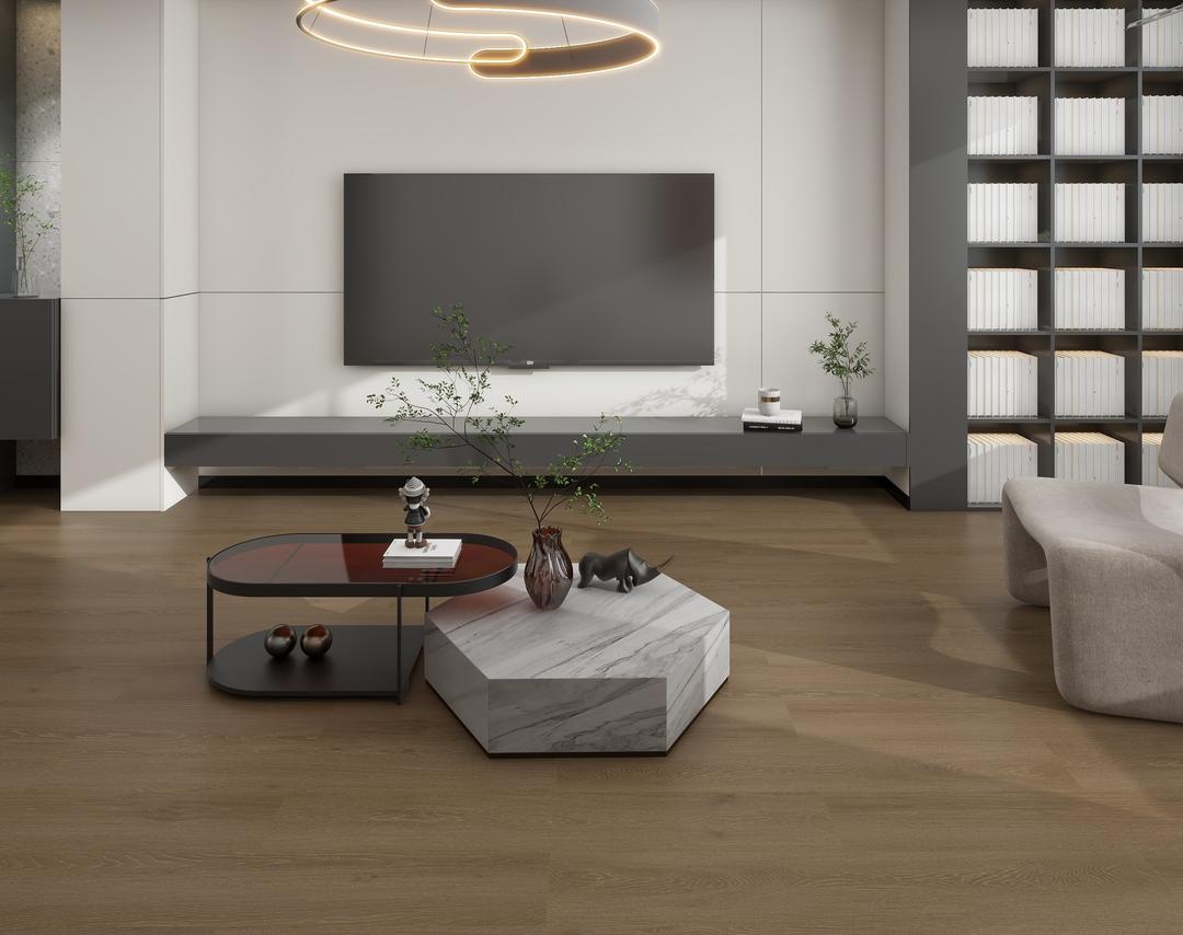 淺棕色地板,以烘焙中的麥芽糖與風(fēng)化陶土共生的漸變層次為靈感,在空間界面拓印出物質(zhì)轉(zhuǎn)化的呼吸節(jié)律。其表面肌理凝結(jié)著沙漠巖層與麂皮絨面交織的悖論觸感——納米級分子沉積技術(shù)復(fù)刻出千年古木的皸裂紋,而動態(tài)熱壓工藝卻在0.2毫米的漸變層中凝固了蜂蜜滴落時的張力曲面。當(dāng)智能光感系統(tǒng)捕捉到晨昏線位移時,色溫會沿晶格結(jié)構(gòu)析出焦糖脆殼破裂時的光譜漣漪,使陽極氧化鋁的科技冷感與手織羊毛的有機(jī)溫度,在千分之一秒內(nèi)完成從量子糾纏到和諧共振的認(rèn)知躍遷。這種色調(diào)如同經(jīng)過慢發(fā)酵的美學(xué)催化劑,既中和了混凝土墻體的地質(zhì)剛性,又為碳纖維織物的未來感注入了可觸摸的原始記憶,讓空間蛻變?yōu)檫B接農(nóng)耕文明與量子計算的雙生載體。
